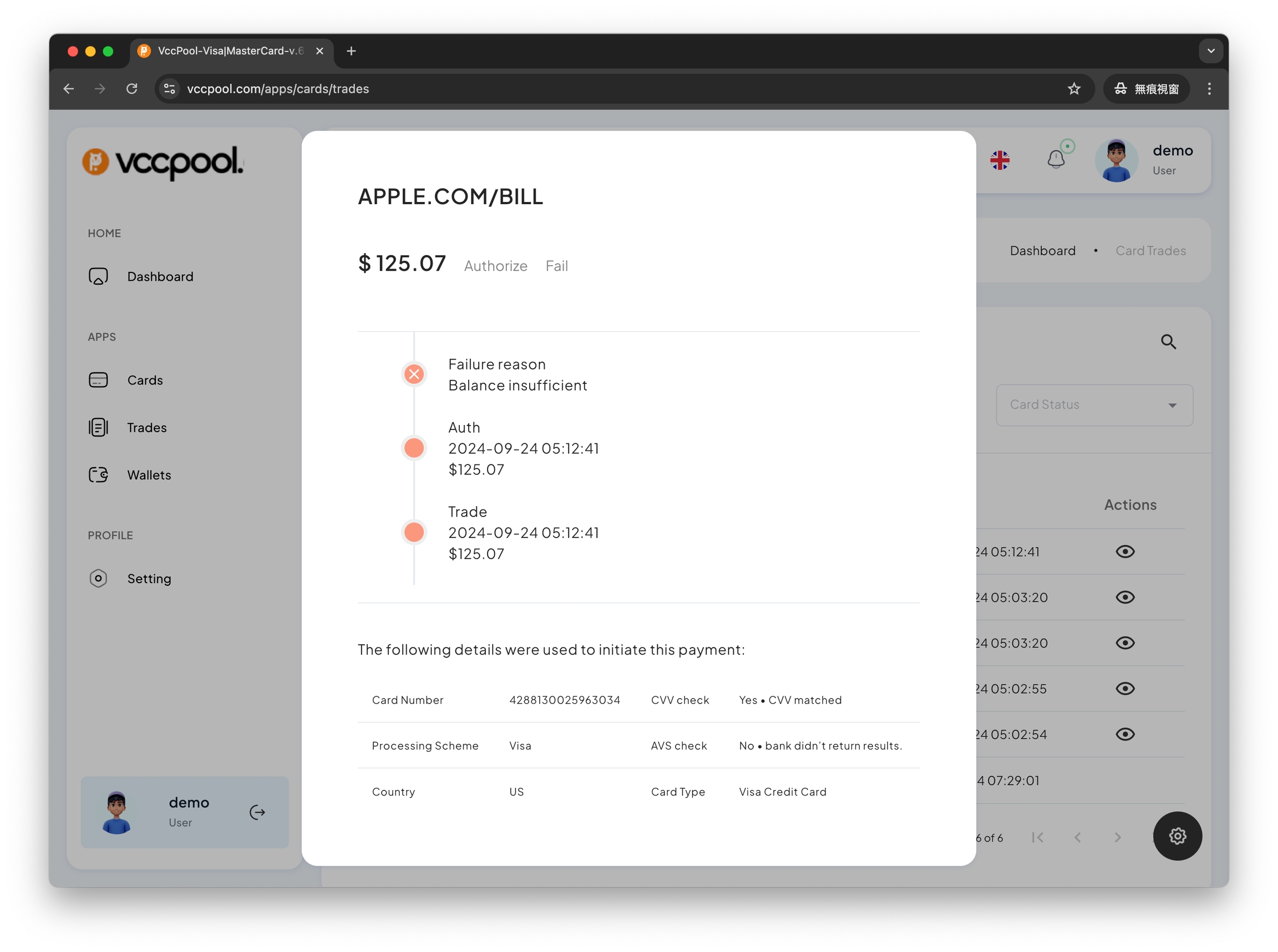 如果您嘗試在卡片餘額不足的情況下進行購買或支付,該交易將被拒絕。您需要通過平台錢包為卡片充值,才能繼續使用。