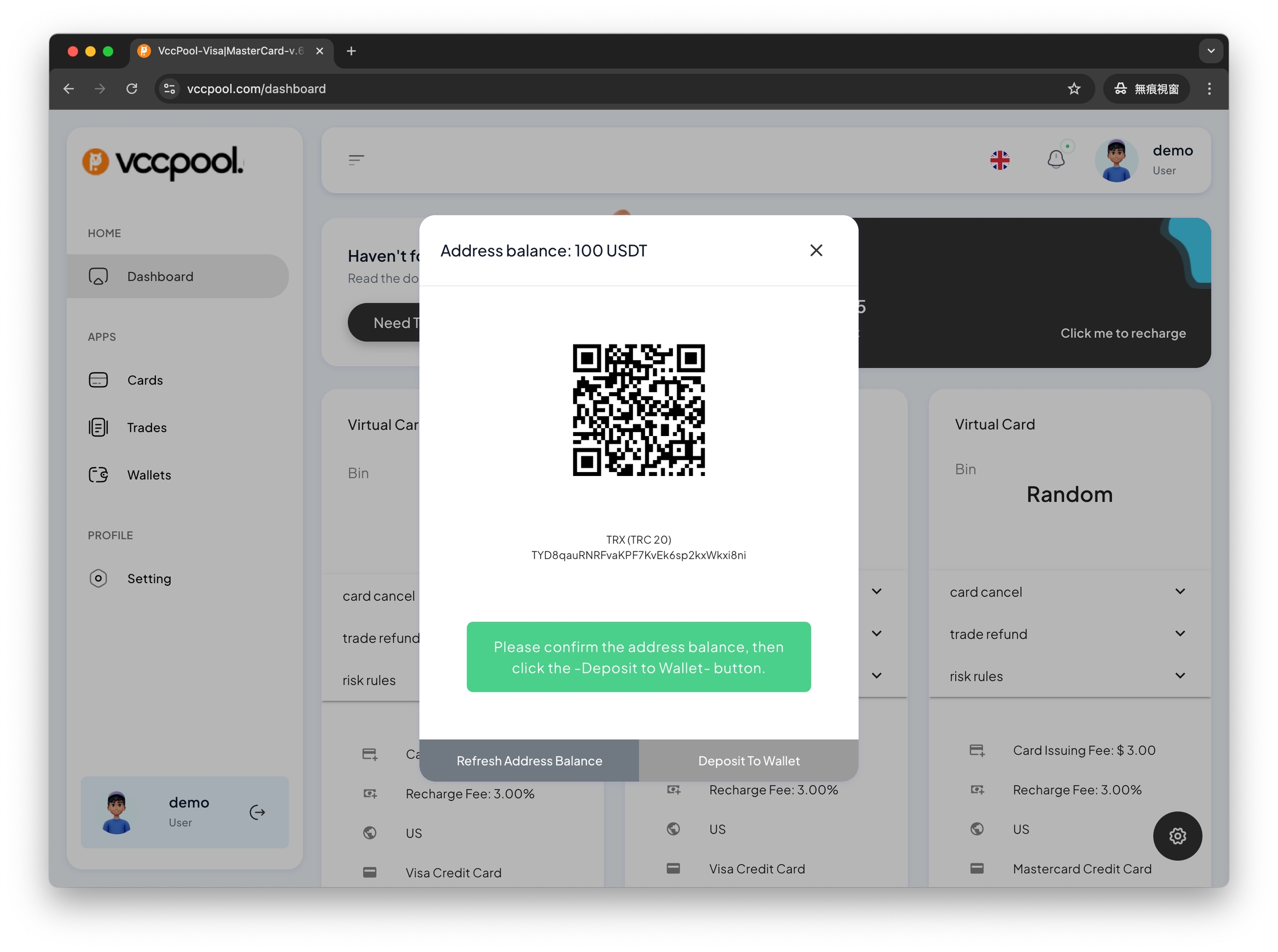 如果您的錢包沒有足夠的USDT來為您的虛擬卡充值,您需要通過TRON網絡將更多資金存入您的錢包後再繼續操作。