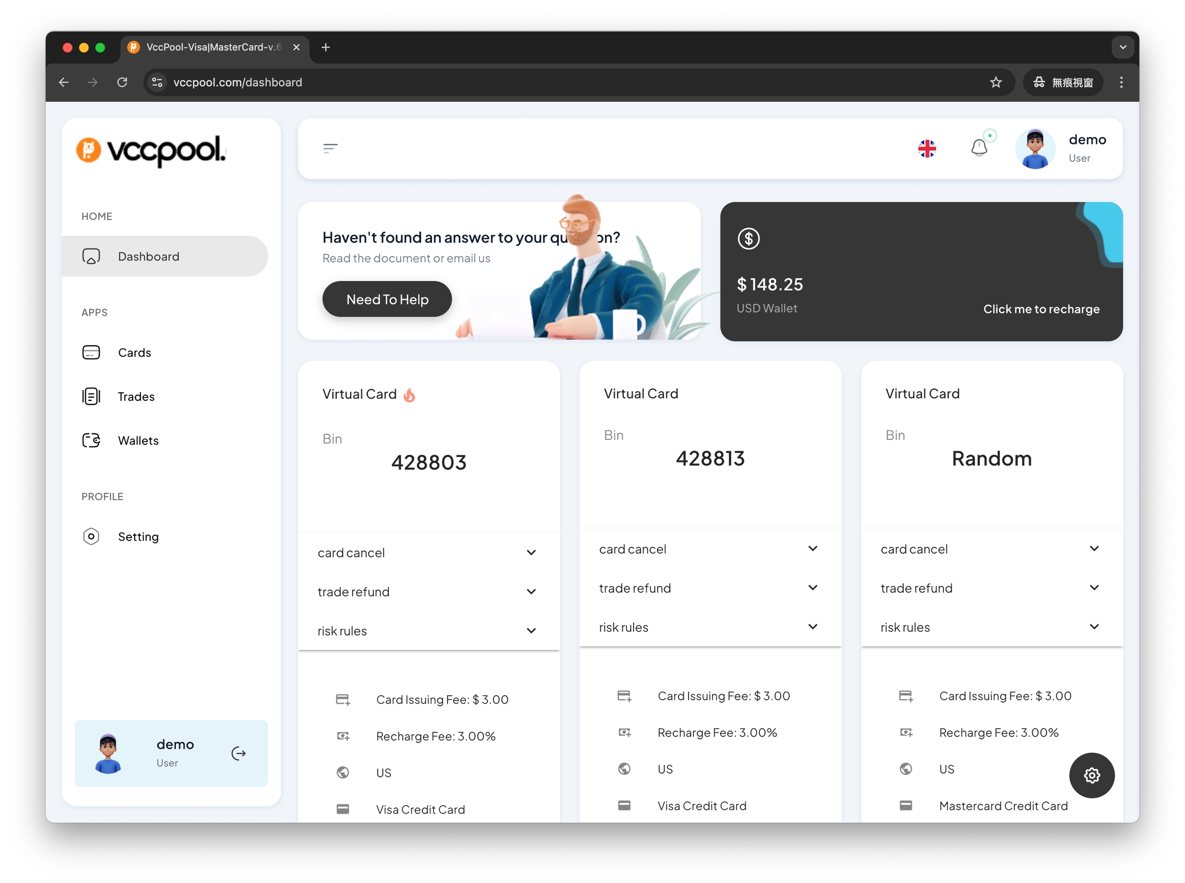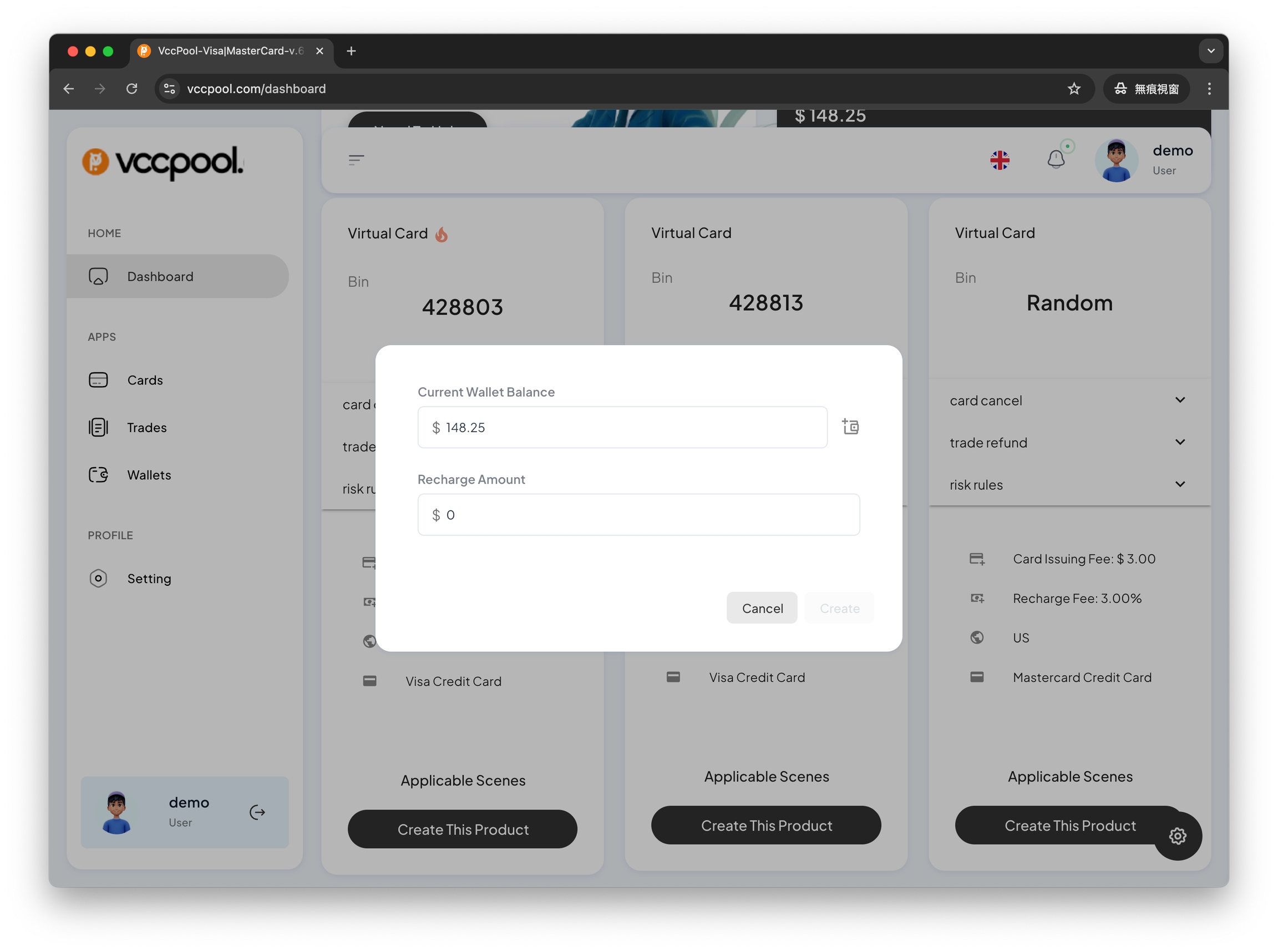 一旦您的錢包擁有必要的資金,平台將自動從您的錢包中扣除指定金額為您的虛擬卡充值。